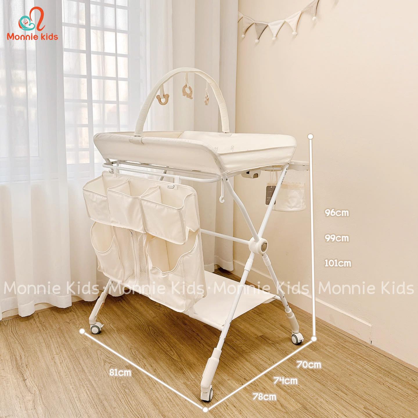 • Kệ 2 tầng trữ đồ rộng rãi, có giá phơi đồ, chậu rửa, hộp đựng khăn ướt, khăn khô, tã & kem dưỡng da…
