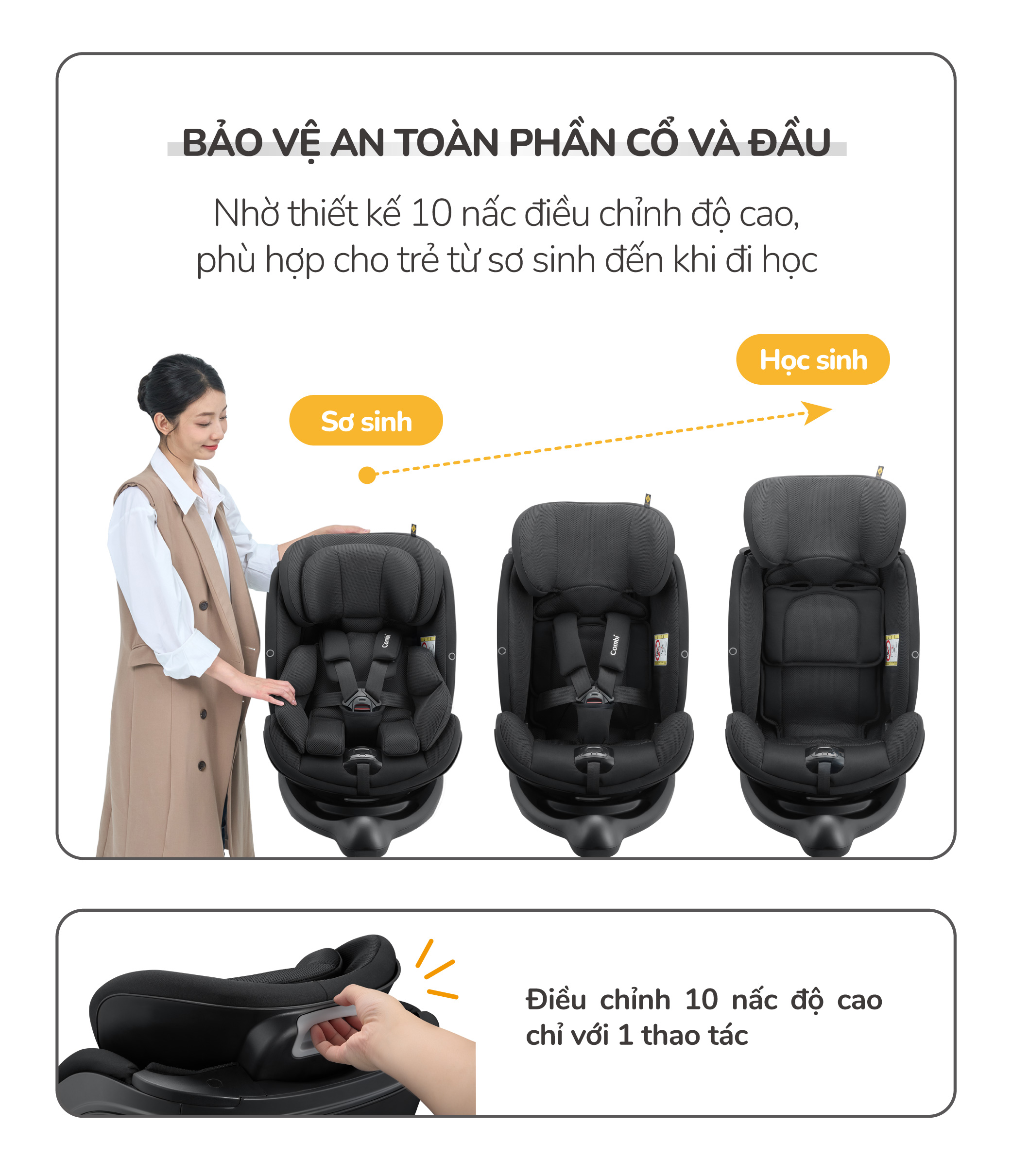 Tựa đầu của ghế có thể thay đổi trong 10 vị trí đế đồ trẻ luôn nằm trong vùng an toàn và thoải mái nhất.