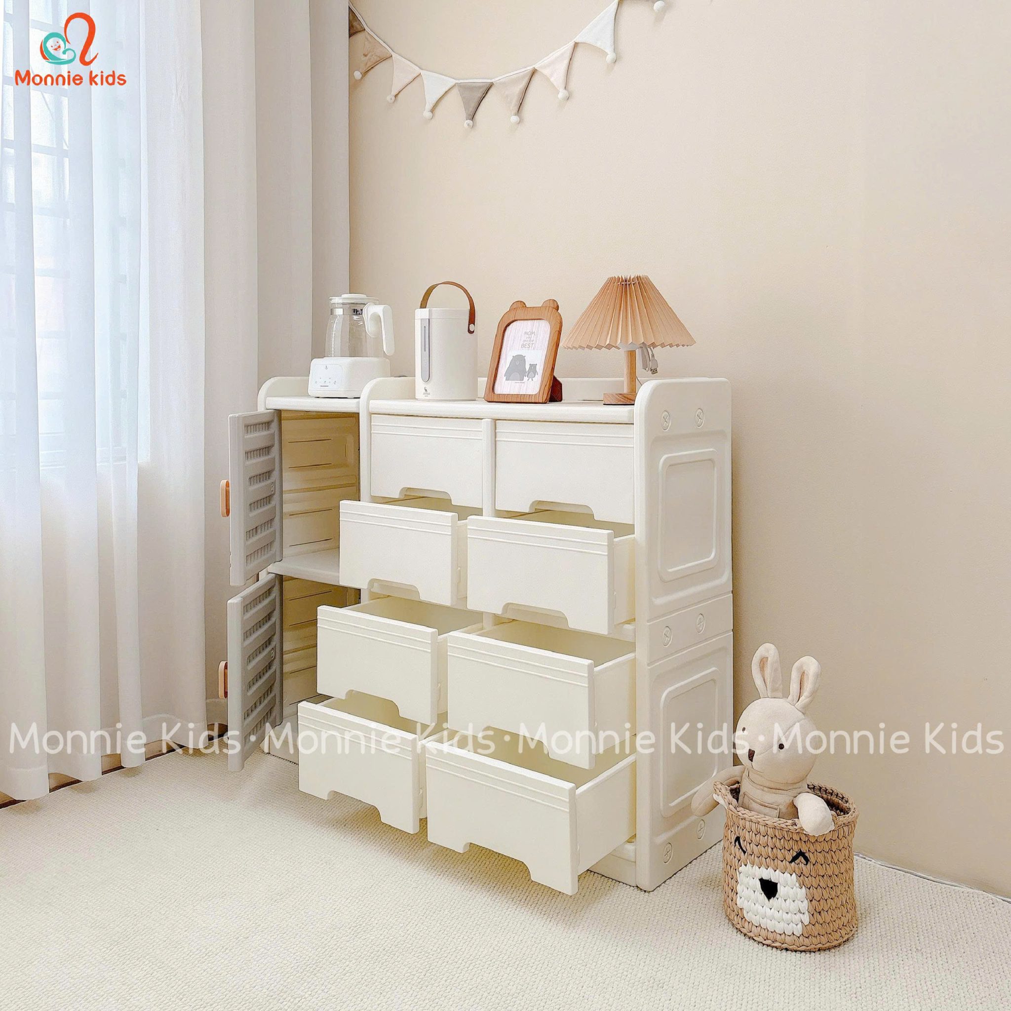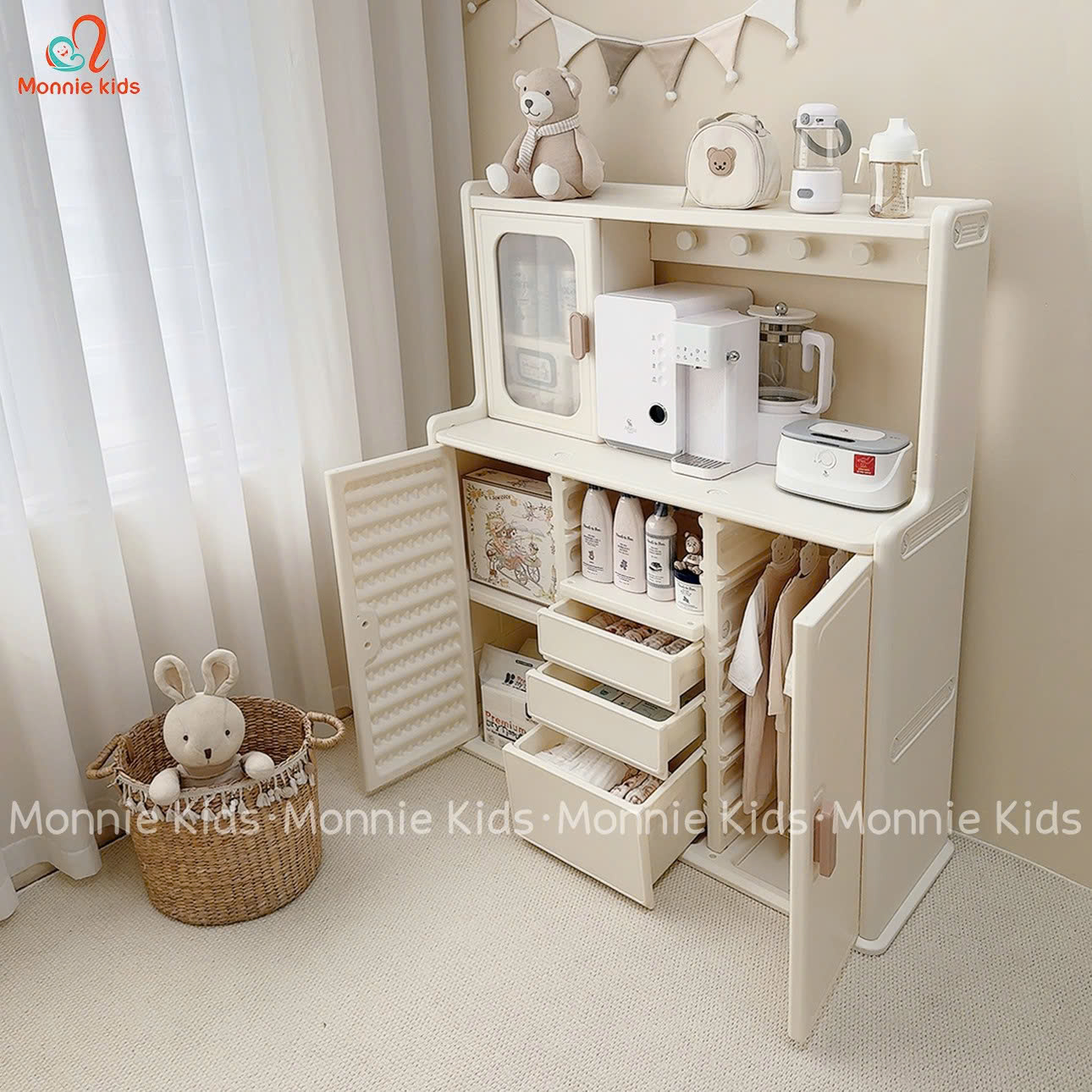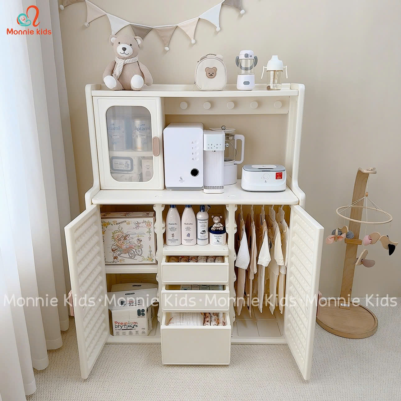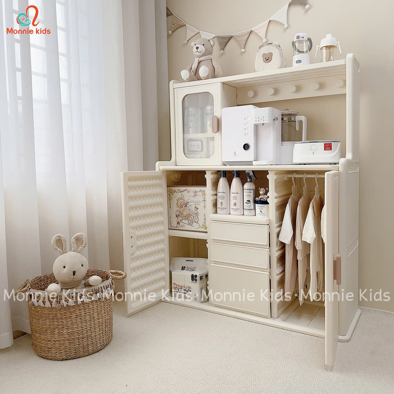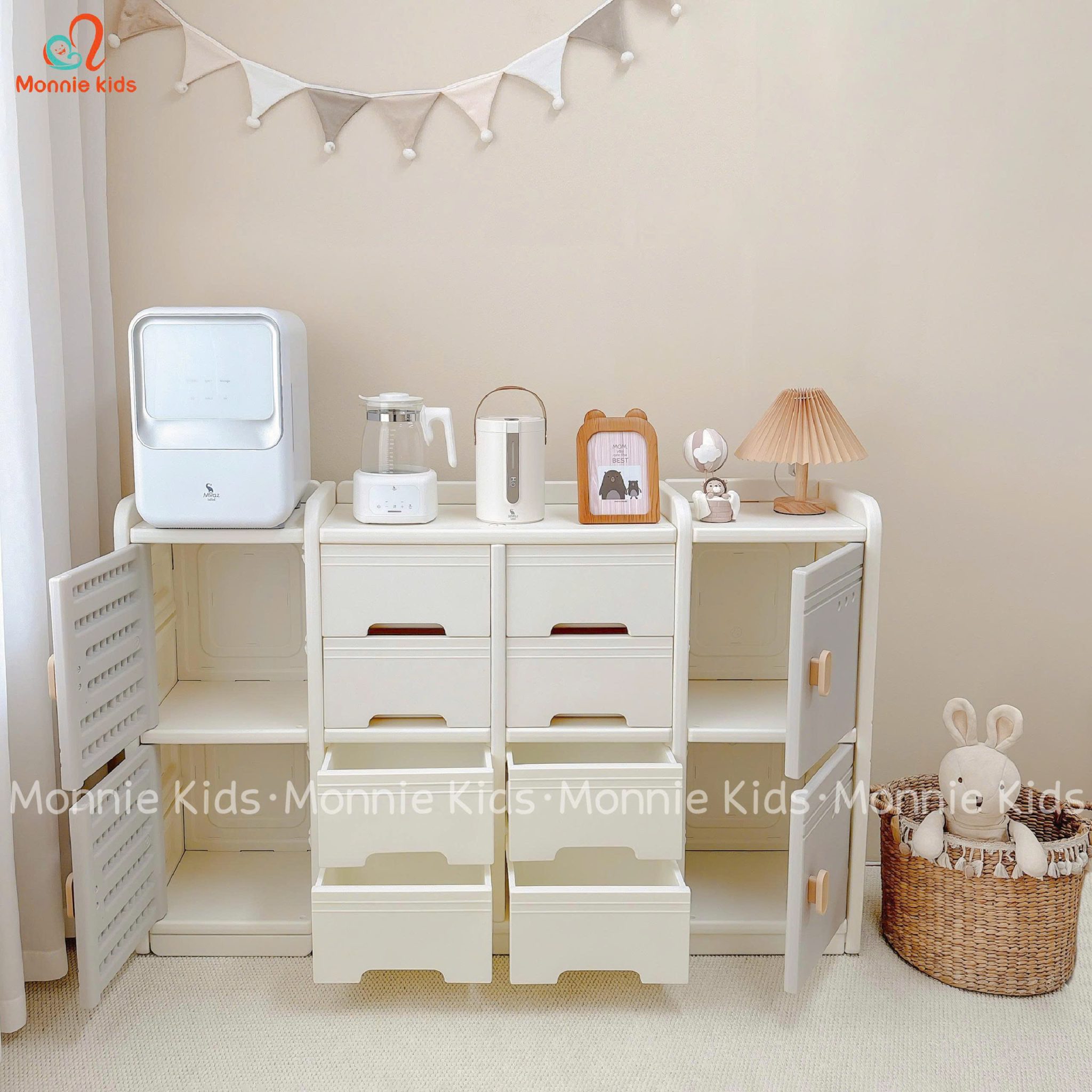 Tủ quần áo cho bé siêu xinh, phong cách Hàn Quốc với thiết kế tủ đựng đồ nhiều ngăn, đa năng với tone màu trắng xinh xắn.